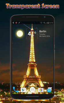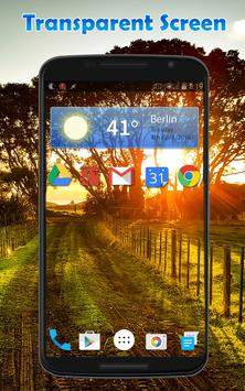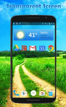 पारदर्शी स्क्रीन पृष्ठभूमि के रूप में अपनी पीठ कैमरे का उपयोग करता है और यह एक नियमित लाइव वॉलपेपर के रूप में लागू होता है। यह अपने वर्तमान लांचर के साथ हस्तक्षेप नहीं करेगा।