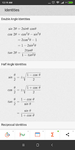 This app mainly deals on Unit Circle Trigonometry. It contains an interactive unit circle for all trig functions such as sine, cosine, tangent, secant and cosecant for both degree and radian between 0 and 360 degrees. It also contains interactive graphs for all the above specified trig functions between -180 to 180 degrees. It is also provided with table of trig ratio for all the trig functions from 0 to 360 degrees with the increment of 15 degrees. As a supplement, this app is also provided with some important trigonometry formulas and identities.