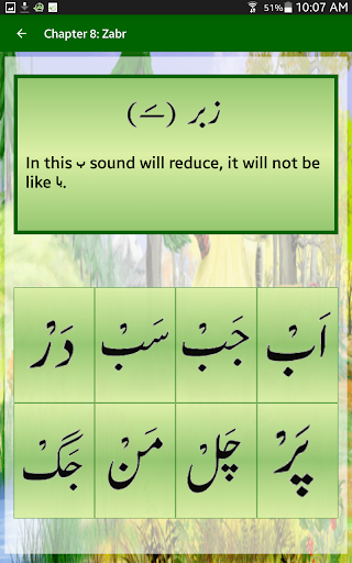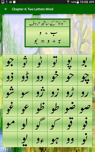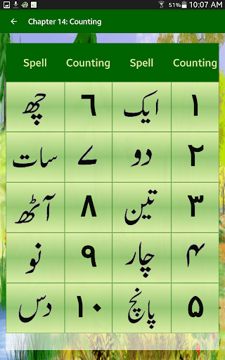 In urdu awaz qaida, urdu language will be taught through sound, pictures and writing. In this app there are 14 chapters and 4 exercises. Following are the names of 14 chapters: