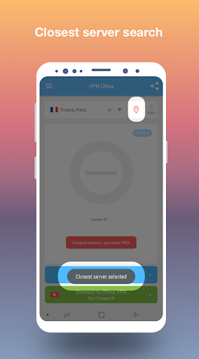 +あなたの便宜のために、私たちは2つの別々の接続ボタンを導入しました。最初にリスト内の選択されたVPNに接続します。 2つ目は中国語のVPNに直接接続します。それは簡単です。 IPアドレスを変更する必要がある場合は、他の国でサーバーを選択して接続を確立するだけです。中国のIPアドレスを取得する必要がある場合は、ワンクリックで中国語のVPNサーバーに接続してください。