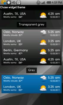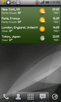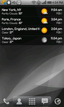 A full featured, world clock widget available in 4x1 and 4x2 sizes. The widget supports an unlimited number of locations and will display local times, current weather conditions and weather forecast.