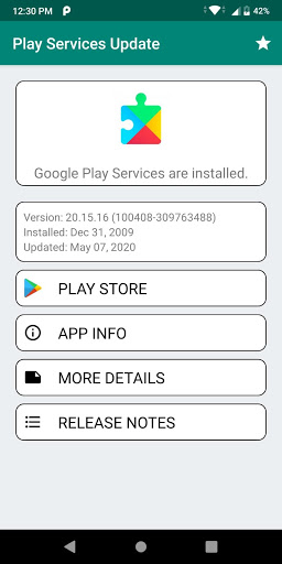 Play Servicesのヘルプ&情報アプリを更新するには、Google Play Servicesのステータスをすばやく確認してください。 Play Services Updateアプリは、バージョン番号、最新のアップデートのインストール日、日付を表示します。それを使用すると、Play Store、Developer Release Notes、およびApp Informationダイアログにすばやくアクセスできます。