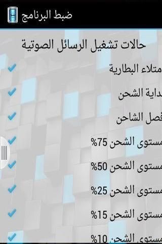 رسائل التطبيق :( توصيل وفصل الشاحن-- قراءة مستوى البطارية عند (75%-50%-25%-15%-10%)-- ضرورة توصيل الشاحن)