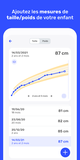 Ajoutez en quelques secondes leurs mesures de taille et de poids, et suivez sur des graphiques simples, clairs et colorés la croissance de vos enfants.