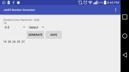 The app provides the generation of numbers to Indian Lottery Jaldi 5 according to user's choice about even / odd numbers and greater or less than 18 numbers