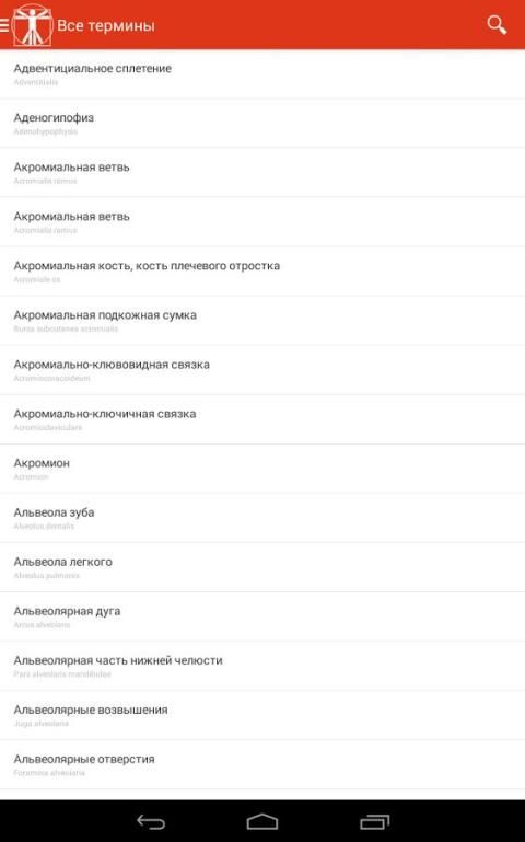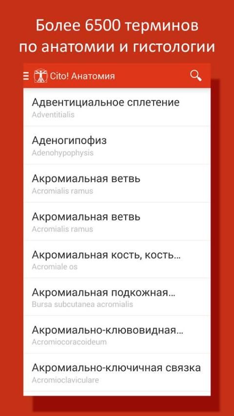 Detailed terms of human anatomy - is a useful, important, necessary, and, most importantly, interesting information contained in the vast google play, you can find a lot of important and necessary information. The manual contains information on anatomy, various years, along with classical concepts and expressions, here you can find the latest discoveries and achievements in this complex science. Special attention is given to the anatomy of an android, a complex scientific guide is designed specifically to get the most detailed information about a person, too, in this manual contains all the necessary charts and tables that you can download in the crib.