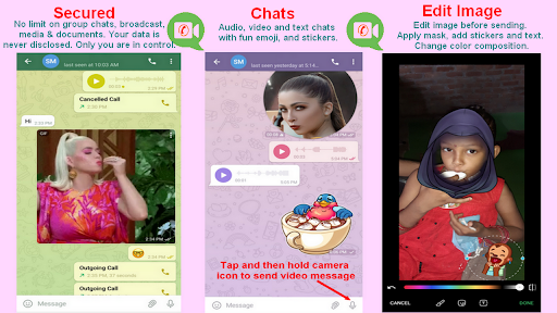 - 無制限のファイルとサイズをフル解像度で送信する必要な限り電子クラウドに保存されるため、デバイス上のディスク容量を消費することなく、最大20万人のメンバーのグループチャットを作成し、大型ビデオを共有できます。(.docx、。 MP3、.zip、.rar、.pdf、.tiff、.psdなど)と最大2 GBまでのサイズである、オンラインコミュニティとチームワークを調整するための完璧なツールです。