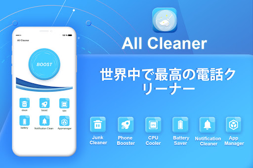 All Cleanerは、android携帯電話の携帯電話のジャンククリーナー、スピードブースターとメモリブースターです。私たちのAll Cleanerは、お使いの携帯電話を清潔、高速、安全に保ち、バッテリーを節約したいと考えています。ワンタップでデバイスのパフォーマンスを向上させることができます。