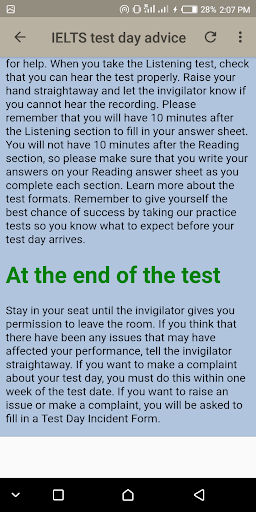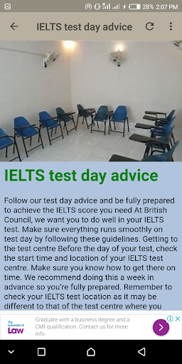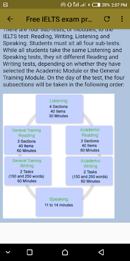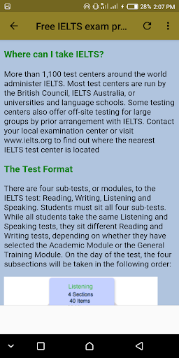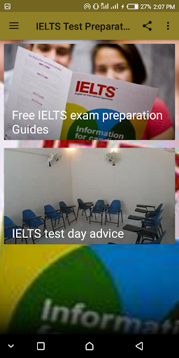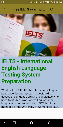 This app of IELTS Test Preaparation contained vital information about IELTS test. Hear what test takers say about IELTS How to prepare Find everything you need to know to prepare for your test, read and understand what kind of things you should get or do before during and after the IELTS Test.