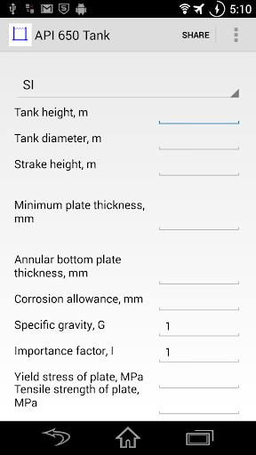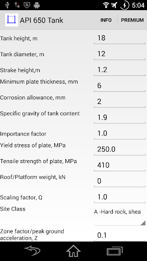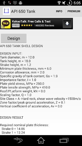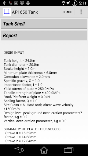 A very simple app to check / design a steel tank shell in accordance with API 650 2013. Design results include -minimum required shell thickness per strake -Ring wall moment, etc.. *internet permission required for ads