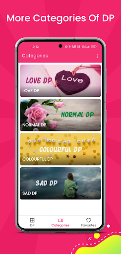 主な機能に焦点を当てて、シンプルなアプリを作成しました。好きなDPを簡単に設定、ダウンロード、共有できます。" d name dp"アプリには4つのカテゴリがあります。