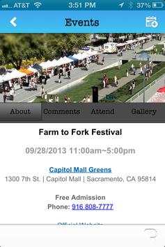 The Farm-to-Fork App gives attendees information about the events during the week-long Farm-To-Fork Festival including events, activities, videos and news. The Festival kicks off an effort to celebrate Sacramento's regional farming communities and to create further demand as a culinary destination, laying claim to being “America’s Farm-to-Fork Capital”.