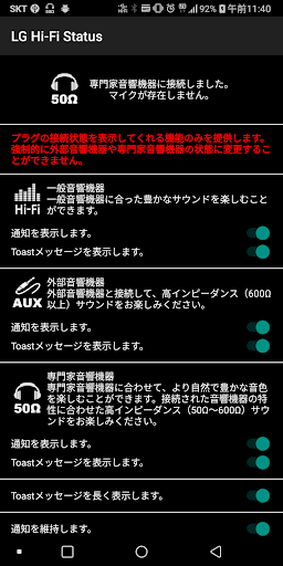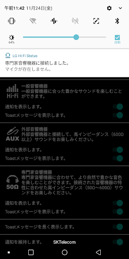 Hi-Fi接続の状態を通知アイコンで表示します。 強制的に接続状態を変更することができません。 サポートモデル:for LG Quad DAC - V10, V20, V30, V30 , V35, V40, V50, V50S, V60 - G6, G6 , G7, G8, G8S - Q8 2018, Q Stylus 2018, Q9 One, Q70 - X4 , X4 2019, X6 2019 オレオOSの互換性が反映されました。