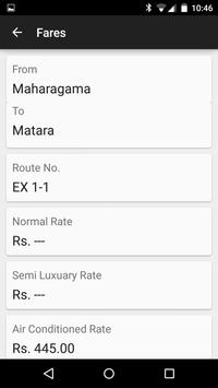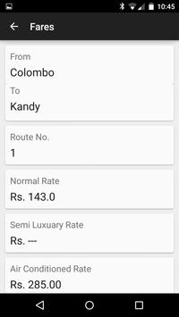 You can get the information about bus fares for major cities in Sri Lanka. Enter the starting location and ending location and it shows you - Route Number - Normal Rates - Semi Luxury Rates - Luxury Rates