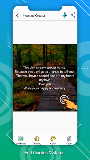 you can edit any type of message & quotes & status with sms & wishes, happy messages, love wishes, best massage, happy message, valentine messages. statusapp are include good morning , good night, birthday whishes, sms collection, sms quotes, wishes, wishes & quotes, wishes app, birthday text, message for whatsapp, short message. message app has wish images, cute message, valentine sms, message friends, text ahead sms, share message, friendship wishes, birthday messages.