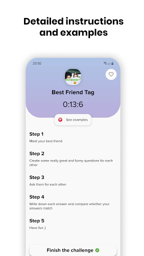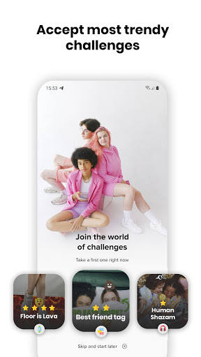 TRENDED - the application contains the most trending challenges form most popular social media - Floor is Lava, Best Friend Tag, Say Yes and many others. Come in and complete the most popular challenges.