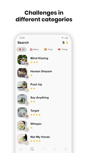 VARIOUS - the application contains challenges in various categories: from food to music and many others. Challenges are provided that can be performed alone and for the company. You can find a challenge for every taste.