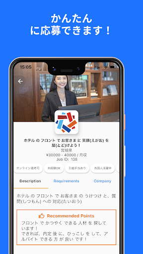 Connect Job WORKERSは、特別技能(とくていぎのう) の しごとを さがしている がいこくじんに いちばん いい アプリです。のうりょくや スキルが ある がいこくじんと 日本の かいしゃの フルタイムの しごとを マッチします。このアプリは むりょうで、しごとを さがしている がいこくじんの ために、つかいやすく つくられています。