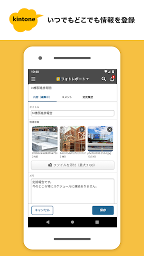営業の商談報告、店舗や工事現場などの写真を添付した状況報告など、オフィス外でもスムーズに業務が行えます。