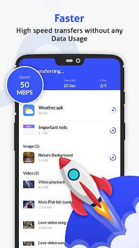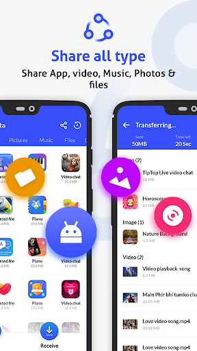 Android用の転送は機能的で最高の共有アプリです。迅速かつ簡単にファイルを転送し、優れた共有ファイルアプリを使用してデータを共有します。グループを作成してファイル転送アプリを使用して複数のPeoplesにファイルを送信できます。あなたはあらゆる種類のビデオ、写真、そしてファイルを取り、共有ファイルアプリを使ってそれを共有することができます。