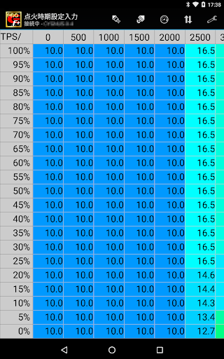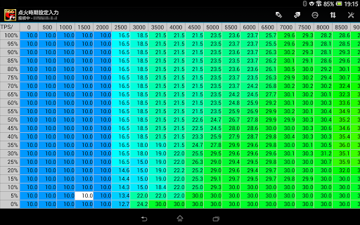 ・点火進角をエンジン回転(500回転毎)・スロットルポジション毎に設定し、編集・書き込み・読み込みができます。またドエルタイムの設定もできます。