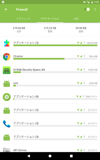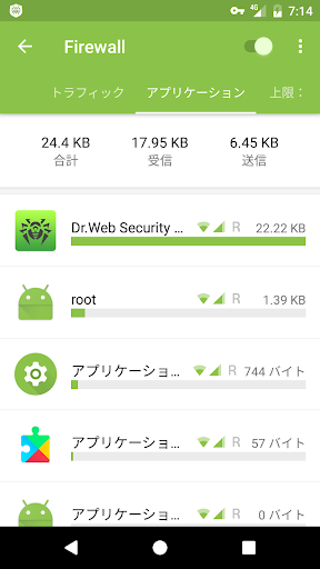 • ユーザーの選択(Wi-Fi、モバイルネットワーク)および設定されたルール(IPアドレス、ポート、ネットワーク全体、特定のアドレス領域)に基づき、デバイス上にインストールされたアプリケーションおよびシステムアプリケーションの外部ネットワークトラフィックのフィルタリング