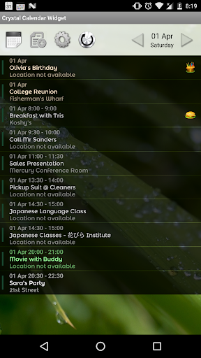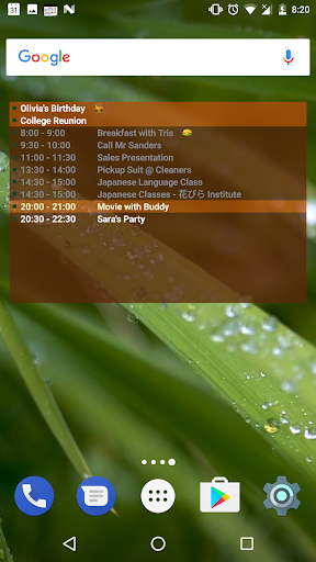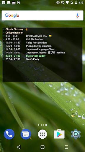 Use this Widget on your Home Screen to show events from your device calendars. Tap on the Widget to open Event List screen. Here you can see events from your calendars for the current day. You can browse dates from a few weeks in the past to a few weeks in the future, and see events for that day.