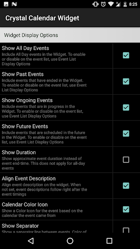 The Widget offers several configuration options to setup content and appearance of the Widget, and that of the Event List screen. For example, you can: