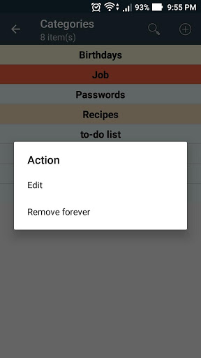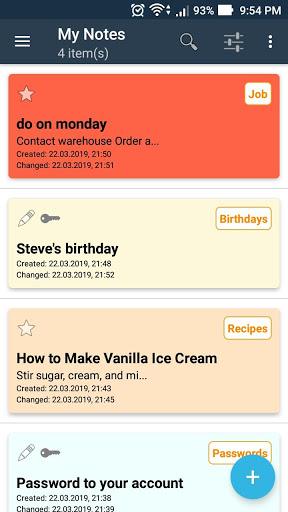 - ノートのカテゴリ、お気に入りへの迅速な移行、およびパスワードの迅速な移行を促す機能保護ノートと誕生日など、そのようなカテゴリのメモに警告を設定する機能。保存された情報をエクスポートすると、他のアプリケーションですばやく使用できます。アプリケーションを使用すると、サードパーティのテキストファイルを表示し、それらをメモとして保存したり、イメージをメモに添付したりできます。