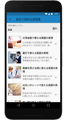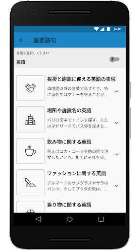 ガイドには「重要語句」と「旅行に役立つフレーズ集」の二つのセクションがあり、旅行に関連したカテゴリによって分類されています。「重要語句」には、日常よく使われる語彙を集めました。「フレーズ集」には、旅行でよくある場面で使えるフレーズを掲載しています。