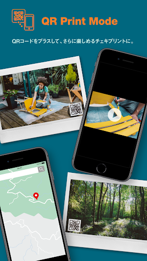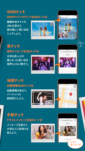 音声メッセージ、テキストメッセージ、地図上の位置情報、WEBページのURLを、その場で自分でQRコード化し、写真に載せてプリントできます。