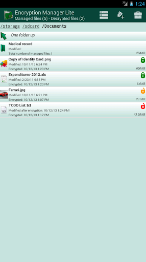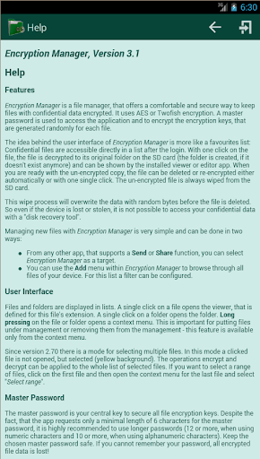 A master password is both used to access the application and to encrypt the encryption keys, that are generated random for each file, that is managed by Encryption Manager. Confidential files are accessible directly after the login. With one click on the file, the file is decrypted to its original location and can be shown by the installed viewer or editor apps. When you are finished working with the decrypted copy, the file is re-encrypted with one click and the decrypted file is wiped from the SD card. This wipe process will overwrite the data with random bytes before the file is deleted. So even if the device is lost or stolen, it is not possible to access your confidential data.