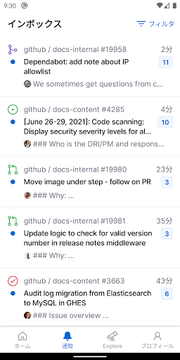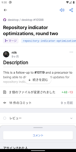 GitHubで行えることの中には、設計のディスカッションへのフィードバックの共有や、数行のコードのレビューなどのように、複雑な開発環境を必要としないこともたくさんあります。 GitHub for Androidを使えば、どこにいても作業を進めることができます。 アプリケーションから直接チームと連絡をとり、Issueをトリアージし、さらにはマージしましょう。 何処で作業をしていても、美しいネイティブの環境から、これらのタスクを容易に行えるようにしています。