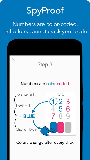 独自のテクノロジは、カラーコードパッドと3つの入力色を使ってパスコードをJumbleするために使用されます。