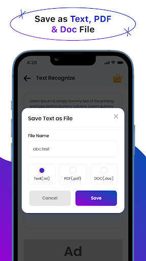 オプション:ユーザーは、変換されたテキストをプレーンテキストファイルとしてエクスポートしたり、人気のある形式でドキュメントとして保存したりできます。pdf&のようにテキスト。