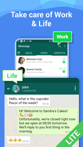 2SPACE Liteは、WhatsApp Messengerプログラムの完全にサポートされています。 1つの携帯電話と2つのWhatsappアカウントにログインします。