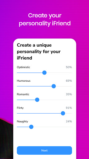 ifrigndは、常に聞いて、応答して、感情的に責任を負うAIです。それは自由に話し、アドバイスを入手し、そして判断なしにあなたの心を開くためのあなたの幸せな方法です。それは私のためのものです。完全にオリジナルの仮想友達を作成するために名前と性別を選択してください。