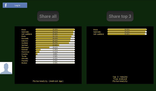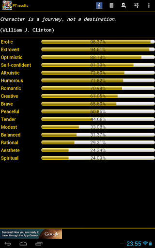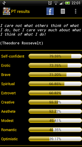 You will get the results concerning 16 aspects of your personality and a quote or an advice depending on your results. History is kept for you to track how your personality is changed over time.