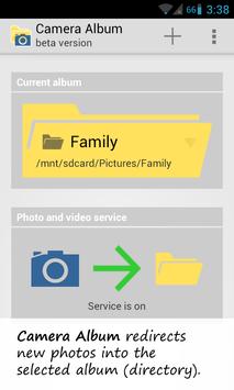 Application Camera Album automatically transfers the captured photos and videos (taken with your favorite camera- app) to the selected album (directory). You can create multiple albums (eg. Family, Work, Trip to Paris, Mountain 2014 ...) and quickly