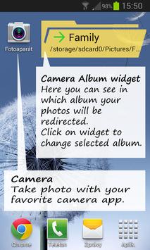 The application also includes a widget to your desktop. This widget displays the selected album , if the service is running and on clicking it you can quickly switch album. We recommend to place it near the camera icon.