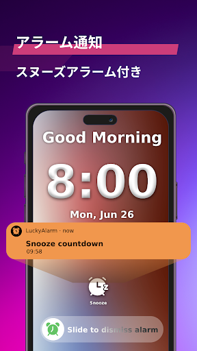 「LuckyAlarm 目覚まし時計: カラフル ウェイク」の特徴的な機能は、あなたの朝にちょっとした魔法を加えます。