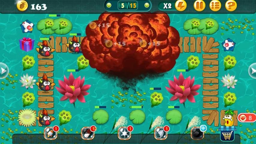 It's the harvest season and the farm has many sweet fruits,animals living there want to steal some fruits for food. So they robbed here and there in the farm,they took all food they could find,leaving lots of garbage. This is nasty and we have to take actions now. As a farmer, you need to use correct towers to defend your farm and kill those animals before they reach the fruits. If those animals eat up all the fruits,then you fail the game.