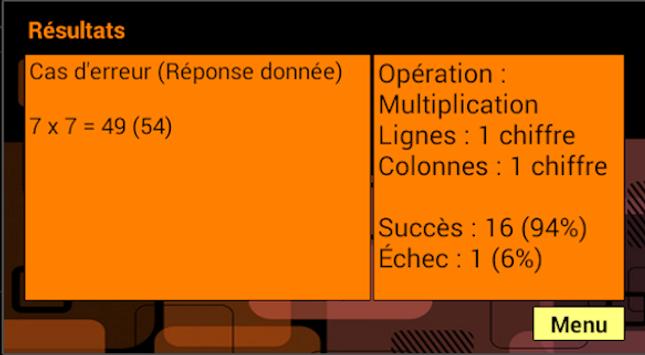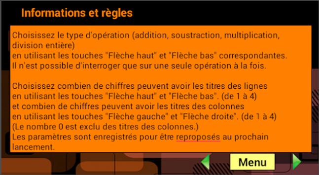 Elle permet de choisir des interrogations sur des additions, soustractions, multiplications et divisions entières. Le choix des paramètres permet d'interroger sur des opérations faisant intervenir des nombres de un à trois chiffres.