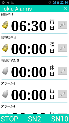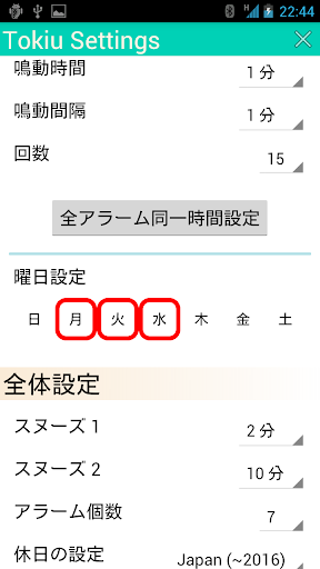 スヌーズ分数・アラーム個数・日本とアメリカの休日の選択 です。
