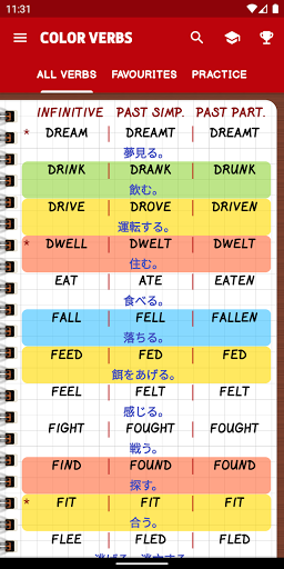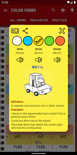 アプリケーション "Color Verbs Pro"英語の不規則動詞のリストを提供します。各動詞には、例が含まれています(例えば、定義、文、写真、音声発音と音声転写)。あなたがより難しいと考えている動詞を強調する可能性があります。これは、後で簡単にそれらを簡単に識別できることを意味します。
