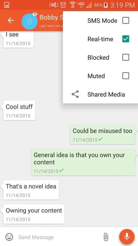 - Ability to toggle sending messages in non real-time (Send message after pressing enter) and realtime mode (Messages are relay to contacts as you type it) and SMS mode from within a conversation.