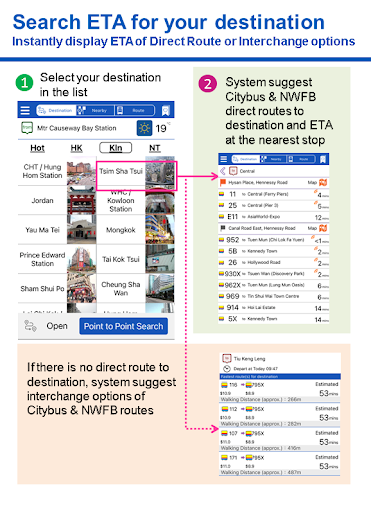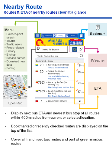 - 共同操作ルートとの長い勝利の出発を含むすべてのCityBusルートから60分以内に次の3つの到着のETAを表示します。kowloon Motor Bus / long Win Bus、新しいランタのバス、data.gov.hk