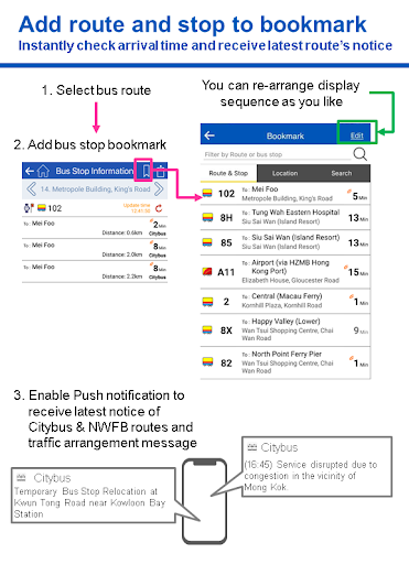 - プッシュ通知を有効にすると、ルート固有の顧客通知とブックマークを参照する特別な取り決めを受け取ることができます。近くのバス停検索とポイントツーポイント検索をスピードアップします。