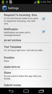 2. Do Not Disturb – blocks calls and SMS from all numbers and auto-respond them via SMS. A custom message is sent to the caller and/ or sender automatically to let them know you are busy. Notification message lets you see calls and/ or SMS blocked;