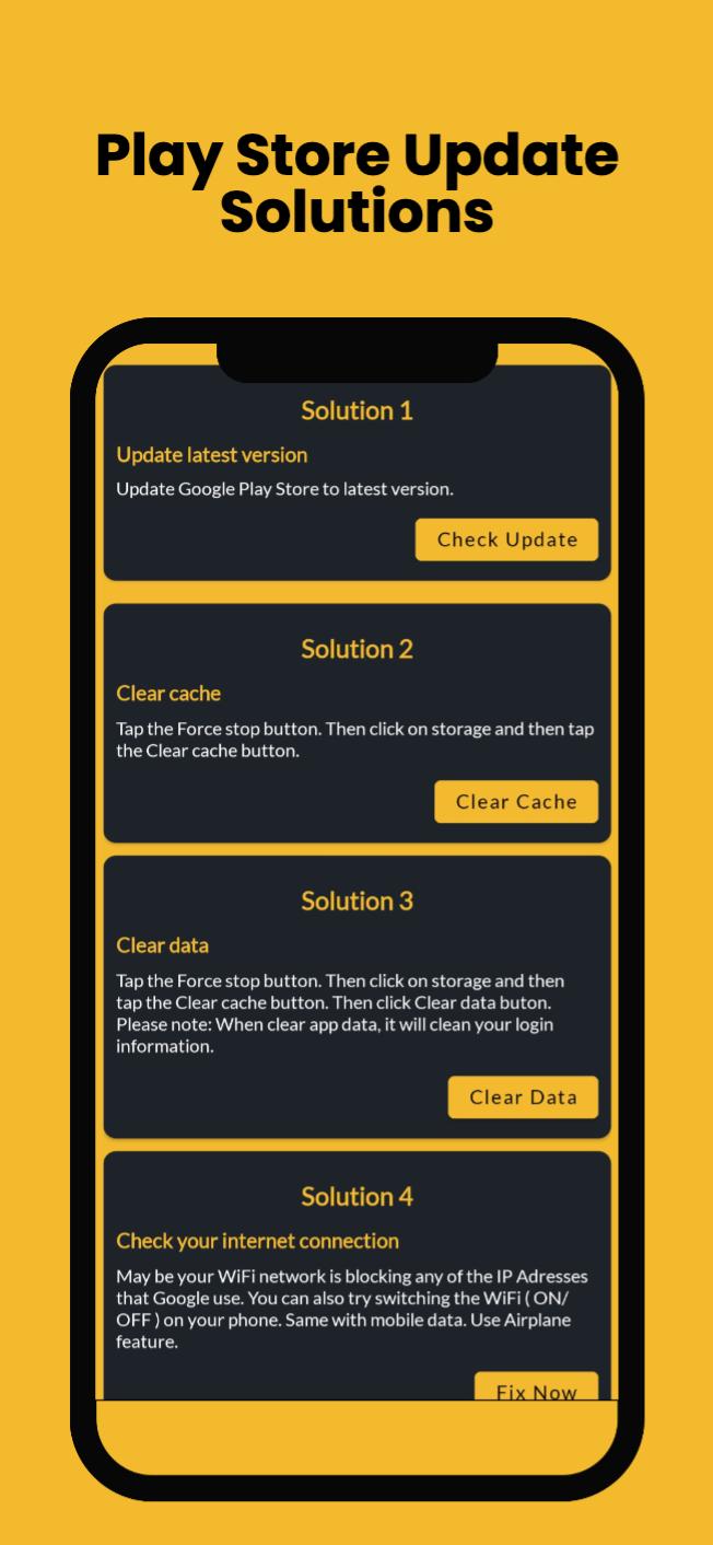 Disclaimer: Play Store Update is not affiliated with Google LLC. This app not collecting any type of user data, only show some information and some tips to solve your errors.